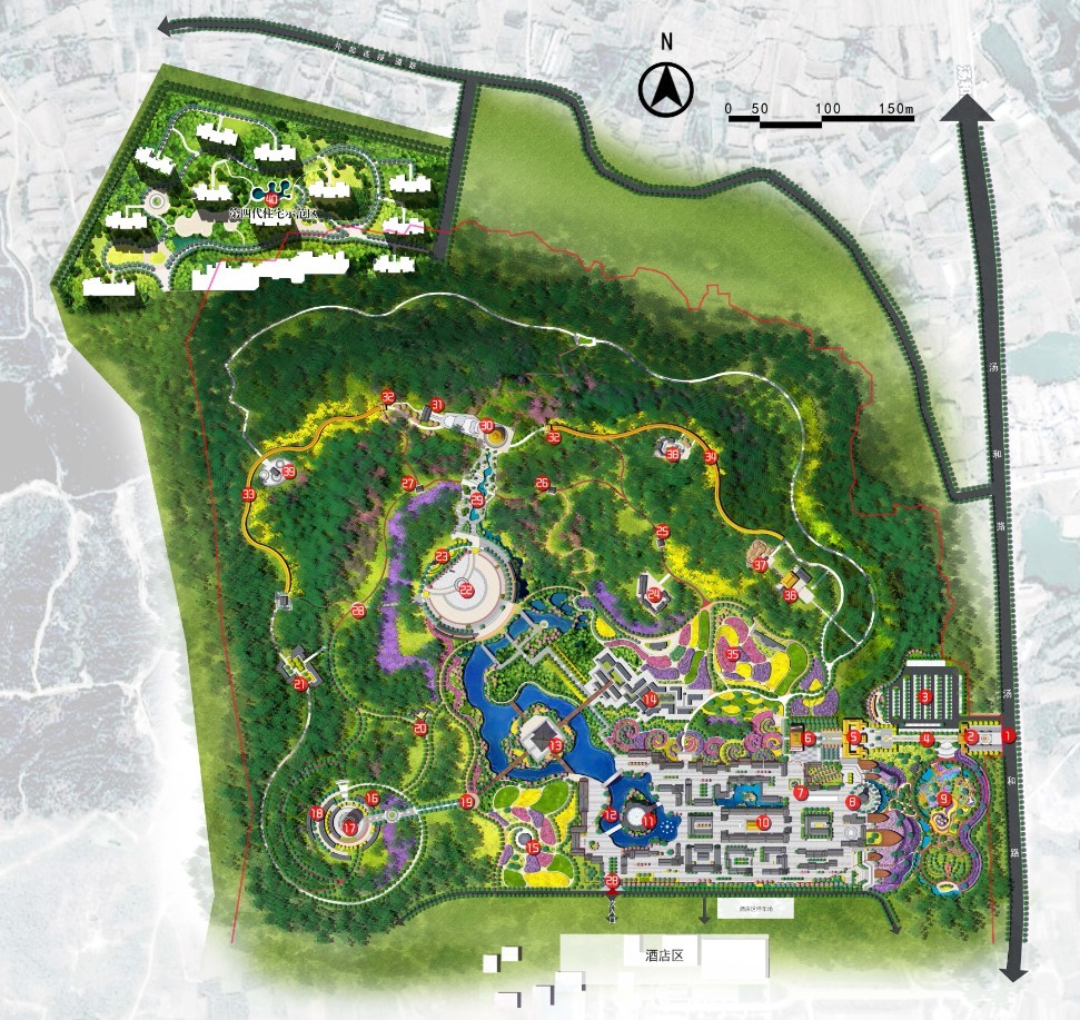 2、一脈西蘆山,傳承大明園;傳奇大明園,多彩龍興地。將整個(gè)區(qū)域規(guī)劃為“兩軸、兩環(huán)串六區(qū)”的總體結(jié)構(gòu)。兩軸為文化演繹軸、文化體驗(yàn)軸,兩環(huán)為內(nèi)環(huán)核心景觀、外環(huán)大地景觀。