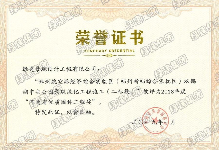 雙鶴湖二標榮獲2018年度河南省優(yōu)質(zhì)園林工程獎