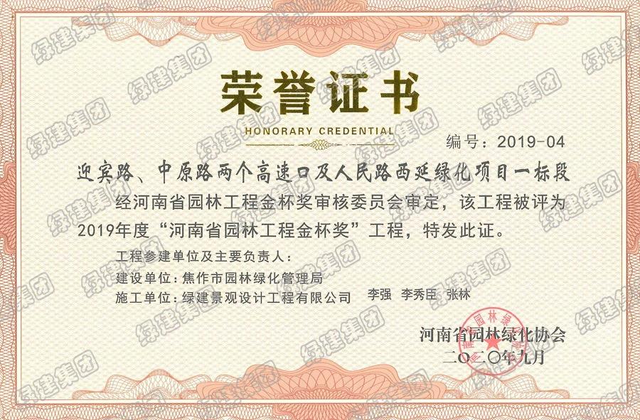 迎賓路、中原路兩個高速口項(xiàng)目榮獲2019年度河南省園林工程金杯獎
